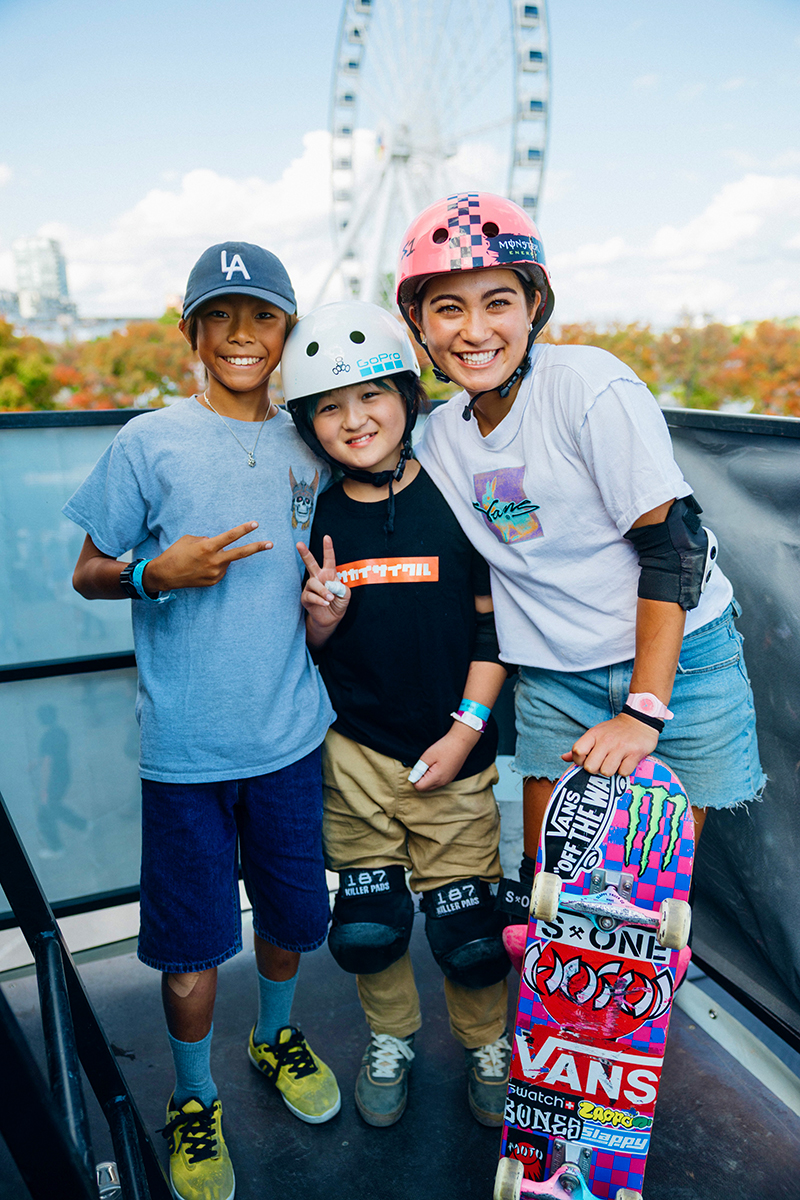 アメリカで暮らすシオン・スガナミくんと、オーストラリアのアリサ・トゥルーと記念の一枚。パリ五輪女子パーク金メダリストのアリサは、今回のバートでも頂点に立った