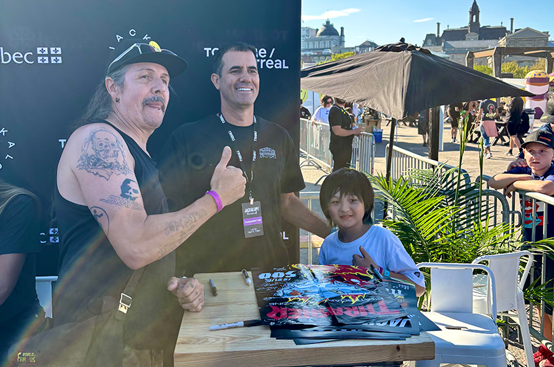 ブラジル出身のレジェンドスケーター、ボブ・バーンクイスト(中央)と一緒にサイン会に参加。我が子ながら信じられない