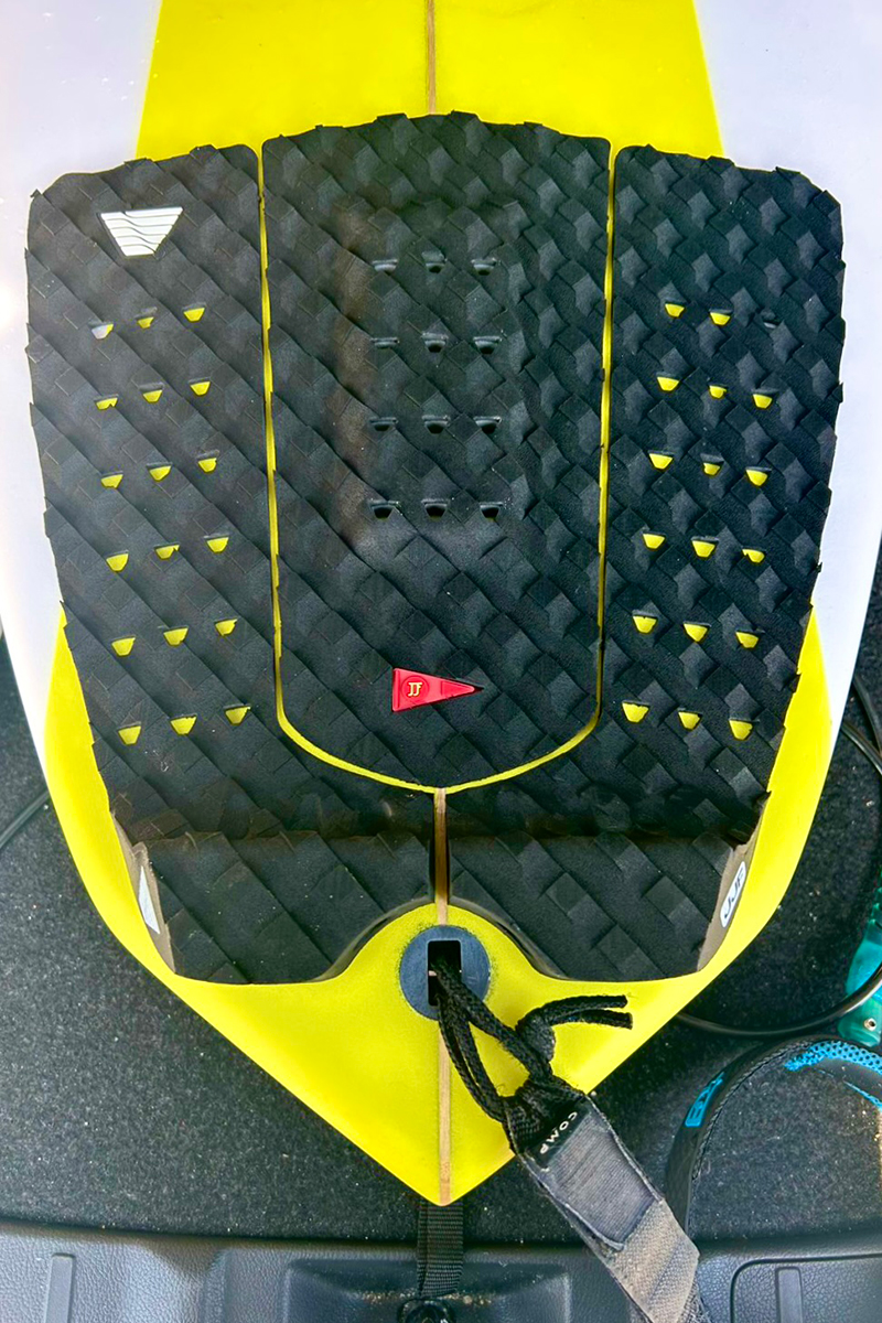 今回の試合の際、サイズのある波でターンしたときにバランスを崩してワイプアウトしてしまったのだが、デッキパッドを後ろに貼りすぎたことが原因だと思った。その影響で、ターン時にテール形状の尖りがホールドできなかったように感じたのだ。これまでそのようなワイプアウトをすることはなかったのだが、練習時にも不可解なワイプアウトをすることがあったので検証し、改善することができた。