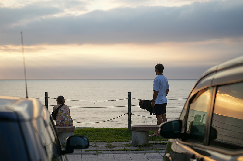 おだやかな光に包まれた早朝の茨城・大洗海岸。波はサイズダウンしていった