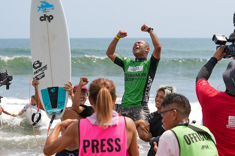 勝利の喜びを全身で表現する河野 正和。マスターズ初優勝を果たした河野は、観戦する同世代のサーファーたちに向けてヒーローインタビューでこう語った。「何事もあきらめずにやるということを心に置いて、サーフィンを楽しんでください」