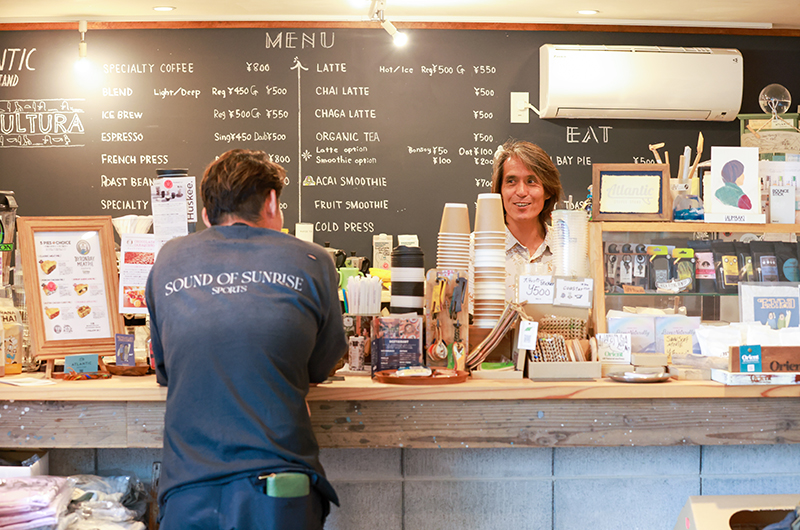 TY:その代わり、ここで交流の場としてカフェ(アトランティックコーヒースタンド)をやることで、より広い視野でいろんな人を受け入れられるようになった。おかげで気持ちも体も安定している。朝6時くらいからお昼過ぎまでお店をやって、午後にサーフィンレッスンを週2~3回やってる。そのあと波がよければ、軽く整える。